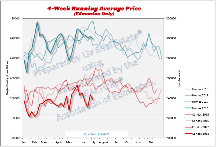 Posted by Anonymous on Thursday, July 12th, 2018 at 1:39amI share the ultrabear perspective, but let's stop pretending like Edmonton is performing anything but sideways for now. Not even 5 updates ago they were making the same noise you are making when things spiked up. Things go up and down, but the trend clearly is sideways; I'll open the champagne and toast you when a April-October average price hits 400 and stays there for a bit. Until then, we're still at 440 and there is no action yet (though I agree record high inventory can't go higher forever).