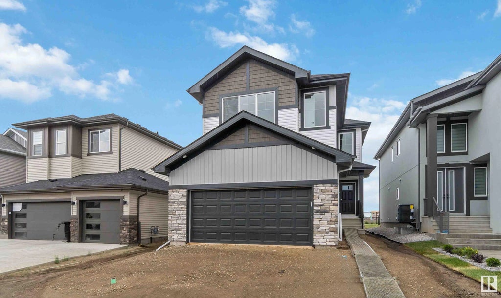 The Artemis is a well-designed 4-bedroom home backing onto a future park and school, with 200AMP service and a separate side entry. It features a double extended garage with floor drain, hot/cold taps, 9' ceilings, LVP flooring, and recessed lighting throughout the main floor. The main level offers a spacious foyer, sitting room, bedroom, full 3-piece bath, and a mudroom that connects the garage to the kitchen via a spice kitchen. The open-concept kitchen, nook, and great room (with a 17' ceiling and fireplace) are ideal for family living. The kitchen includes quartz countertops, a large island, Silgranit sink, tiled backsplash, chimney hood fan, and full-height Thermofoil cabinets with soft-close doors. Upstairs features two primary suites—each with walk-in showers, double sinks, and walk-in closets—plus a bonus room, laundry area, third full bath, and another bedroom with walk-in closet. Extras include an appliance package, upgraded railings and lighting, rough-in plumbing, and additional side windows.