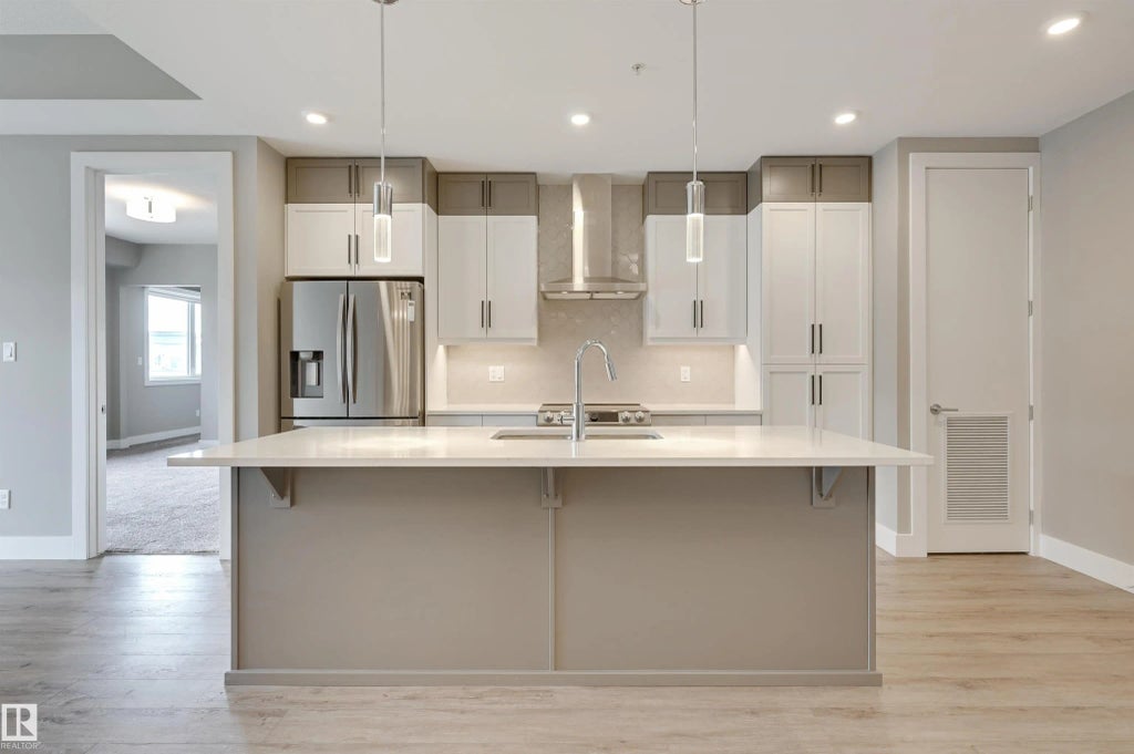 TOP FLOOR UPGRADED LUXURY! This stunning 2 bed, 2 bath + den condo in sought-after Griesbach delivers over 1,300 sq. ft. of refined living with 10 ft. ceilings & premium upgrades throughout. The kitchen showcases quartz countertops, a 4-seat island, full-height two-tone cabinetry, designer tile backsplash, stainless steel appliances, & a custom beverage centre with extra cabinetry. The open-concept living room features east-facing windows with motorized blinds, upgraded vinyl plank flooring, & access to the private patio. The spacious primary bedroom offers a walk-through closet with custom built-ins & a beautiful ensuite. A versatile bonus room is ideal for an office, nursery, or gym. The second bedroom is paired with a sleek 4-piece bath. Additional upgrades include a full laundry room with custom cabinetry, TWO underground parking stalls, and extra storage. Veritas residents enjoy premium amenities: fitness centre, guest suite, social room, & A/C. All just steps from shops, cafes & future LRT.
