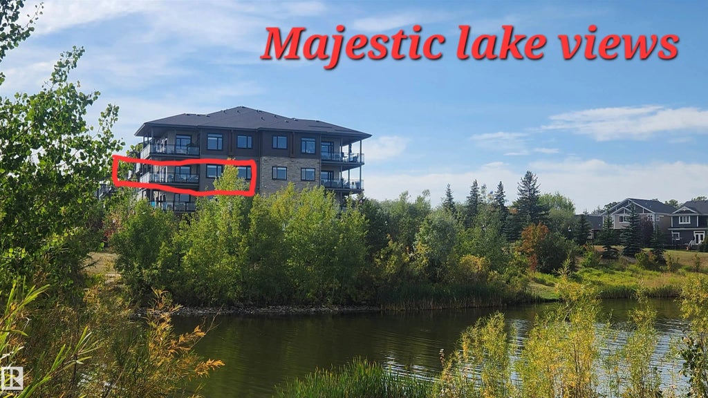 Extensively upgraded lake-facing corner unit in sought-after Veritas, offering awe-inspiring views from every angle. This immaculate one-owner home features 2 spacious bdrms, 2 baths, & a bright den. Enjoy sunny mornings & shady evenings on wrap-around deck. The two-tone kitchen is a standout with upgraded appliances, a tile backsplash, & a 6” extended island with added cabinetry on both sides. Designer lighting, magazine-worthy layout & décor, & a spa-inspired ensuite. A/C. Over $25,000 in thoughtful upgrades also include barn doors, premium flooring, custom shower tile, additional quartz countertops, blinds, hardware, & a second (surface) parking stall that adds everyday convenience, plus a heated stall with secure storage. Pride of ownership shines throughout—clean, cozy, and stylish. Located steps from countless amenities in one of Edmonton’s most desirable communities, this home offers a seamless blend of comfort, elegance, and breathtaking views. Style meets serenity in this Griesbach gem!