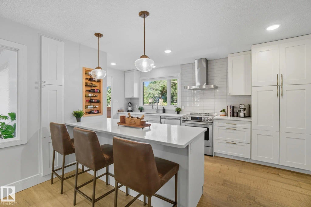 Solar-powered and fully renovated, perfectly positioned in one of Edmonton’s most desirable communities with Whitemud Ravine views right outside your front door. Paid-in-full solar panels efficiently run the heat pump and central A/C, plus a backup furnace, keeping comfort cost-effective year-round. Inside, modern updates blend with timeless style. The bright kitchen offers white cabinetry, quartz countertops, stainless steel appliances, and a large peninsula with seating, opening to the dining area. A wood-burning fireplace anchors the living room, while the family room leads to a private, fully fenced spacious backyard with deck and mature trees. Upstairs is a rare find with 4 generous sized bedrooms, including a primary suite and full ensuite. The finished basement adds a large rec room, bedroom, full bath, and storage. Additional features include main floor laundry, Hardie board exterior, new upstairs carpet, alley access with potential for a garden suite.