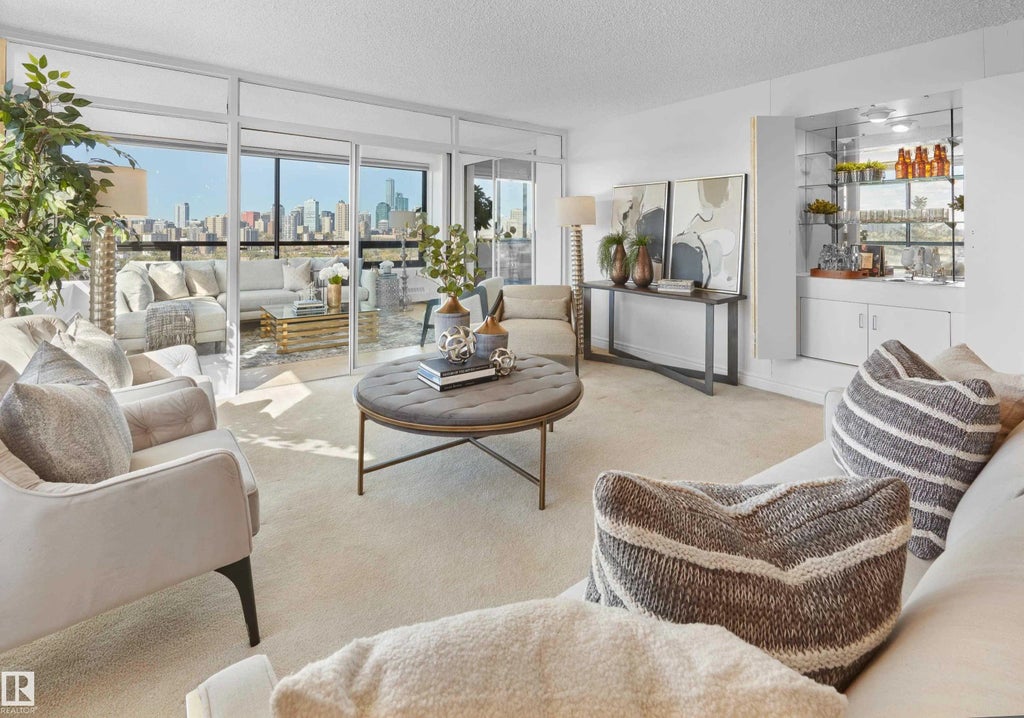 Welcome to executive LIVING at 9929 Saskatchewan Drive — a truly one-of-a-kind 2200 SQFT condo offering unparalleled panoramic views of Downtown Edmonton and the River Valley, framed by the beauty of mature trees and lush greenery. This stunning 2 bed, 2 bath home features a sunroom, den, balcony, wet bar, and 2 titled underground parking stalls with storage unit, perfectly designed for luxurious comfort. Enjoy a modern white kitchen with quartz countertops and new stainless steel appliances, elegant marble tile and hardwood flooring, custom cedar built-ins, and a spacious Primary suite with walk-through closet and 5-piece en-suite. The expansive living and dining areas flow together into the sunroom, where the skyline and treetop views create an inspiring backdrop year-round. Amenities include a pool, jacuzzi, sauna, gym, games room, party room, and en-suite laundry, with all utilities included. Steps from Millcreek Ravine, River Valley trails, U of A, top restaurants and the Strathcona Farmer's Market!
