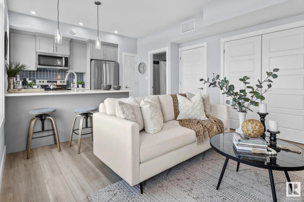 We are pleased to introduce The Coltrane—an exceptional new townhome that embodies style, functionality, and modern design. This unit features 500 square feet (builder size) of meticulously designed living space located in the highly desirable Southeast community of The Orchards. The home showcases designer-selected finishes that seamlessly combine elegance and practicality. Upon entering, you will be greeted by 9-foot ceilings and exquisite luxury vinyl plank flooring that extends throughout the dining, living, and kitchen areas. The kitchen is equipped with full stainless steel appliances, 3CM quartz countertops and is complemented by an abundance of natural light from large triple-pane windows. The convenience of having the primary bedroom, bathroom, and laundry (appliances included) all on one level enhances ease of living, while you can also enjoy your morning beverage on your exterior patio. The Orchards is a vibrant, family-friendly community in southeast Edmonton. Pictures are from another unit