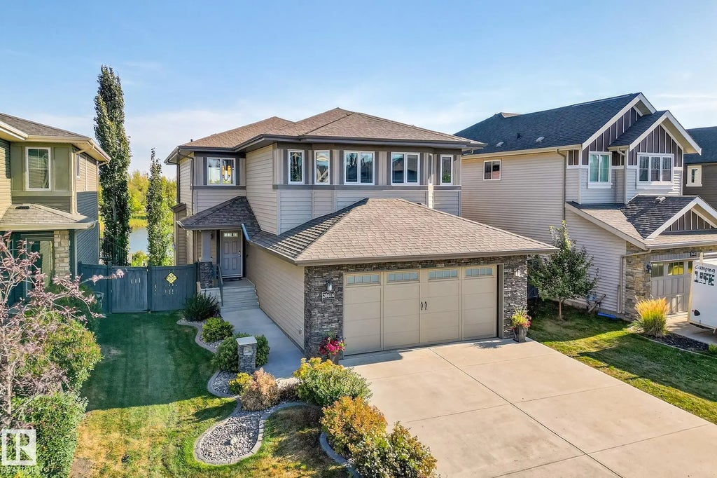 Welcome to this stunning 2-storey walkout in the desirable community of Trumpeter, offering rare lake views right from your backyard. The main floor is highlighted by soaring ceilings in the open-to-above living room, anchored by a stone fireplace and large windows that flood the space with natural light. The gourmet kitchen features granite counters, rich cabinetry, stainless steel appliances, a spacious island, and direct access to the dining area and deck overlooking the water. Upstairs, you’ll find 3 bedrooms, including a serene primary retreat with a private balcony, walk-in closet, and spa-inspired ensuite. The unfinished walkout basement leads to a beautifully landscaped yard with a stone patio, perfect for evenings around the fire while enjoying peaceful lake scenery. This property combines elegant interiors with a natural setting, creating a home that is both welcoming and impressive, while the location offers quick access to nearby parks, trails, and the conveniences of St. Albert and Edmonton.