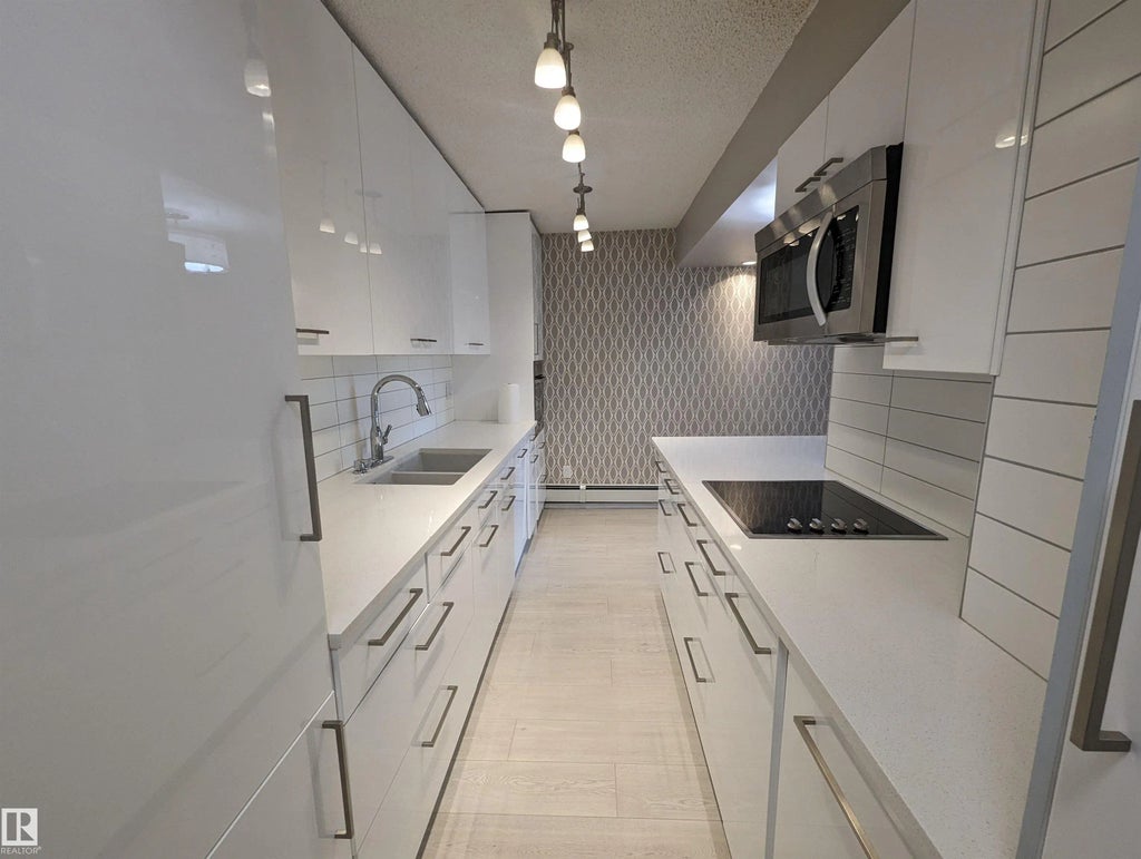 Welcome to The Fifteen! Located on the second level, just off Jasper Ave & blocks away from the BREWERY & ICE DISTRICT! Prime location, residents easy access to superb shopping, dining, the University of Alberta & Grant MacEwan. This sleek unit boasts a modern design with pristine white tile floors, white kitchen featuring Quartz countertops, eating bar, & stainless steel appliances. The spacious layout includes a bright living room, dining area, dedicated office space, convenient in-suite laundry facilities, and an impressive 4-piece marble bathroom equipped with a high-end multi-body spray nozzle shower and luxurious soaker tub. The master bedroom features a walk-in closet for added convenience. Complete with air conditioning, a parking stall, and a covered patio, this unit offers both comfort and functionality. Residents of this well-managed building also enjoy access to top-floor amenities including an exercise/yoga area and a rooftop deck boasting breathtaking 360-degree views of downtown/Oliver.