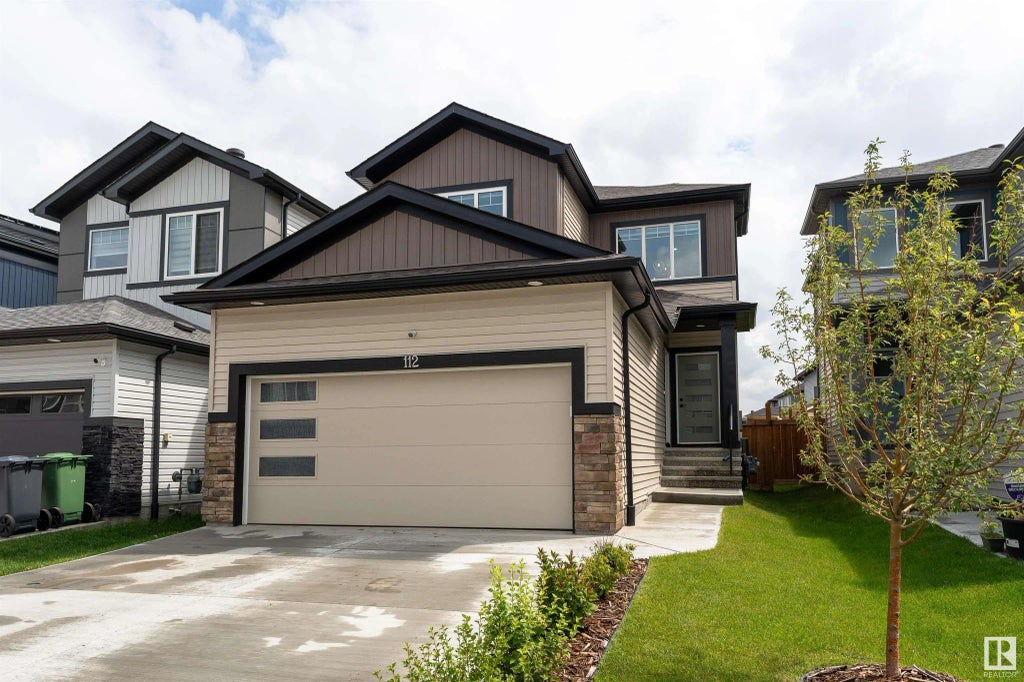 Welcome to 112 Bluff Cove, a modern 1,460 sq ft two-storey home in Leduc. Featuring 3 bedrooms and 3.5 bathrooms, this home boasts 9 foot ceilings and large windows that fill the space with natural light. The open concept main floor includes a contemporary kitchen with a central island and a cozy living room with an electric fireplace perfect for relaxing evenings with family and friends. Upstairs, the primary bedroom offers a four-piece ensuite and walk-in closet, plus two additional bedrooms, a full bath, and convenient laundry. A well-maintained lawn provides the perfect setting for outdoor entertaining, with a gas line and space to gather around a BBQ or a fire table. The unfinished basement with a separate side entrance has a full bathroom for a potential suite opportunity. Central air conditioning, double attached garage and custom blinds throughout the house complete this inviting home. Conveniently close to major routes, schools, Century Mile Racetrack, Leduc Common shopping, and Pigeon Lake Park.