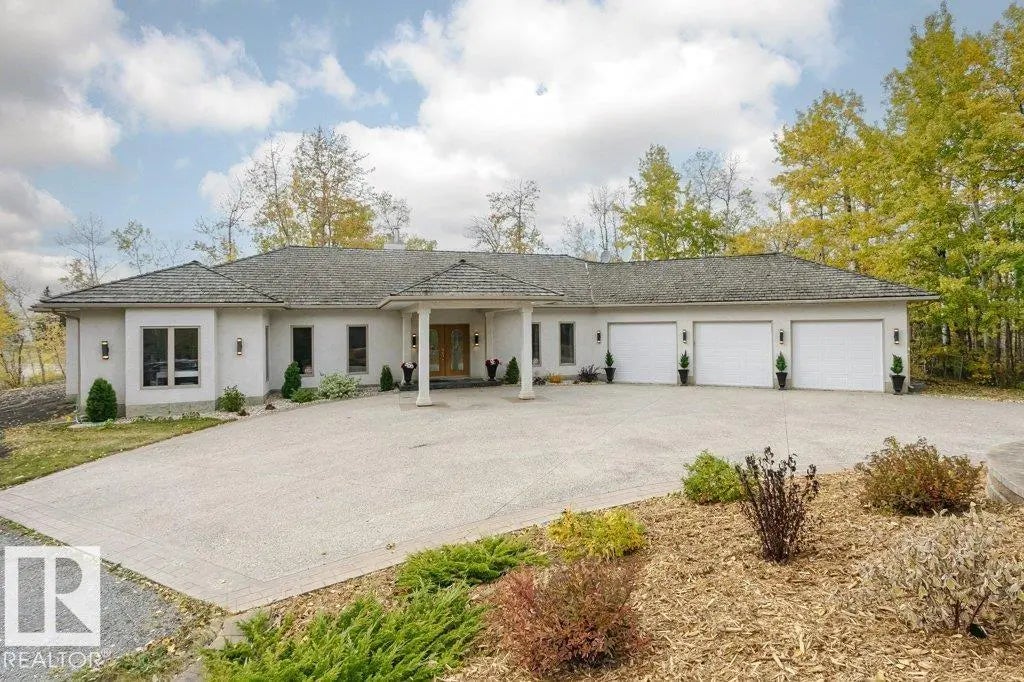 Natural, private setting just minutes from Sherwood Park. Bird watchers delight! This bungalow has an open design with expanses of hardwood flooring and 9 Ft. ceilings throughout. Some of the many upgraded features are the steam shower in the primary bedroom 5 pc. ensuite, with heated tile floor. The primary bedroom is very spacious and also has a walk-in closet. The other 2 bedrooms are on the other end of the house and are large and bright. There's a renovated jack & jill bathroom between them. Enjoy the warmth of a 2-sided fireplace that divides the living room and dining area. The heated triple garage has lots of storage room beside room for 3 full-size vehicles. The deck is massive and includes an area covered by a beautiful gazebo structure. There is are two storage sheds. One has been used as a playhouse. The crawl space foundation is over 5 ft. in height with a concrete floor. No shortage of storage spaces in this lovely home.