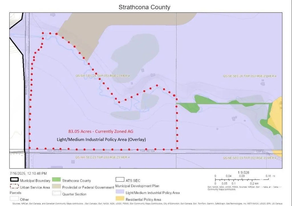 83.05 acres nestled in the heart of Strathcona County's Light/Medium Industrial Policy Area. There is huge potential with this revenue generating property. Annual pipeline revenues from the Heartland Pipeline corridor that runs along the NW edge of the property generate over $15,000 annually. Currently zoned Agricultural General (AG), there is potential for rezoning to Direct Control, Light or Medium Industrial for many permitted and discretionary uses. Located north of Aecon Infrastructure and at the corner of TWP 534 and Sherwood Drive, this is a prime location!